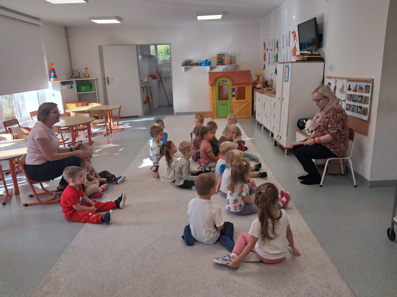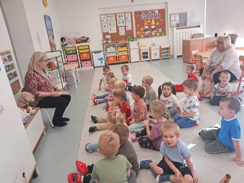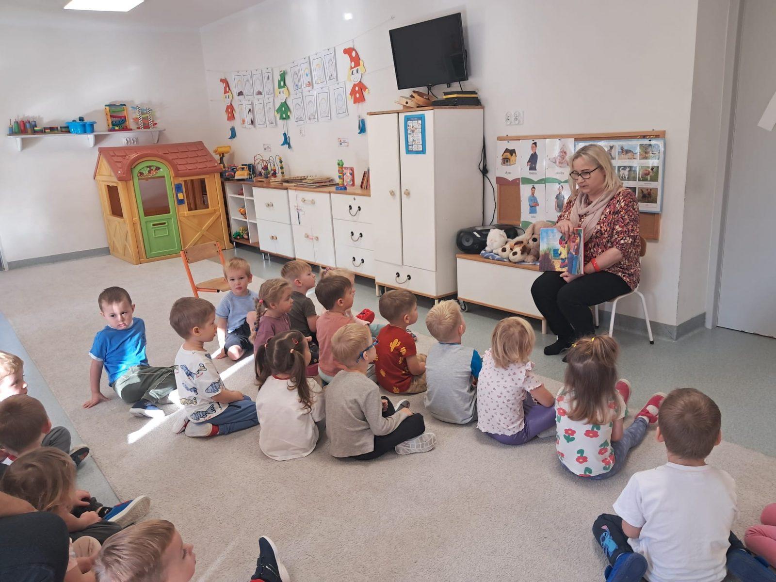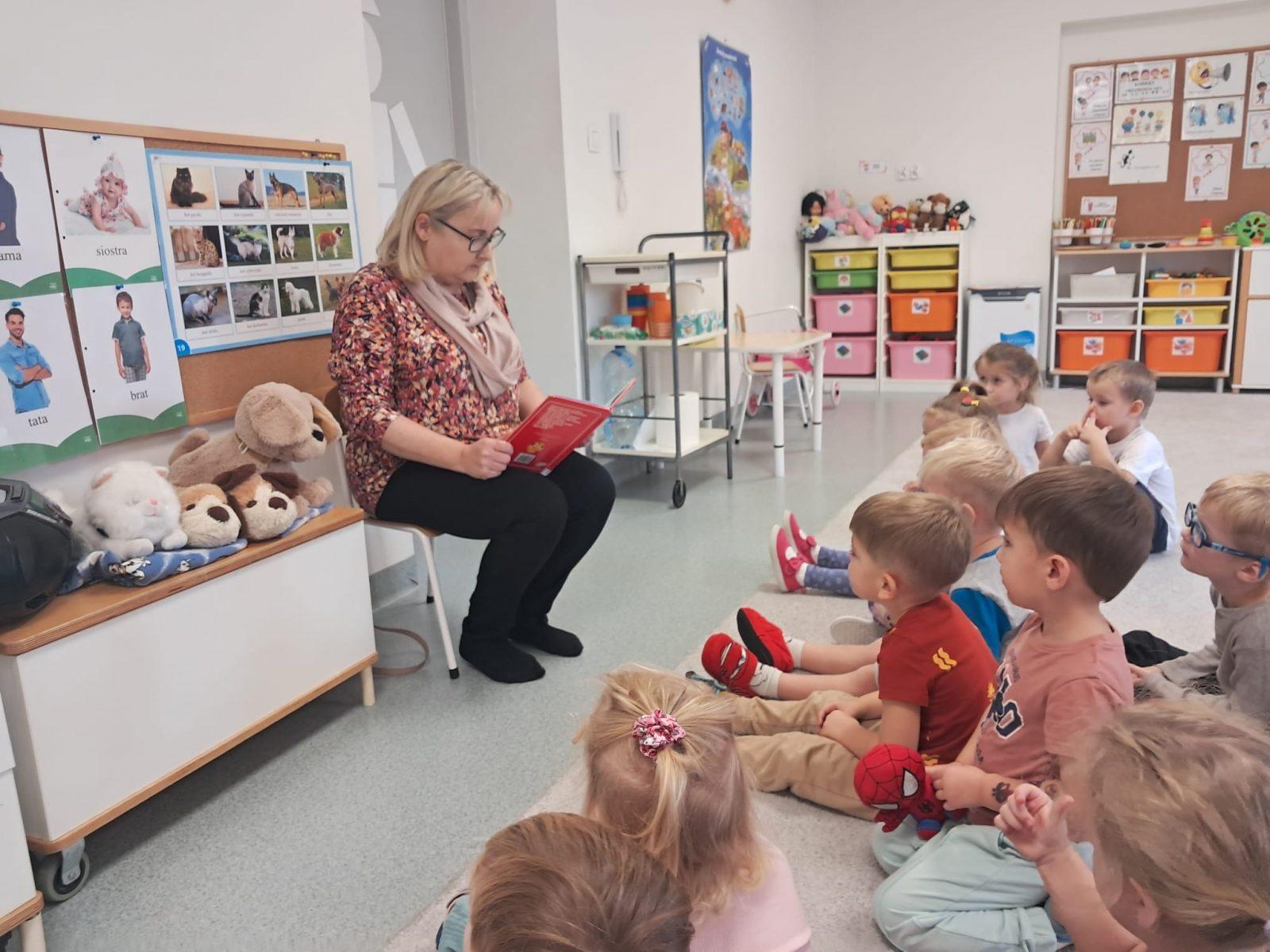 Spotkanie „Krasnoludków ” z panią Anią z biblioteki. Lubimy słuchać jak nasza pani nam czyta. Pani bibliotekarka też nas do tego zachęca i czyta nam śmieszne wierszyki. Zapraszamy do biblioteki.