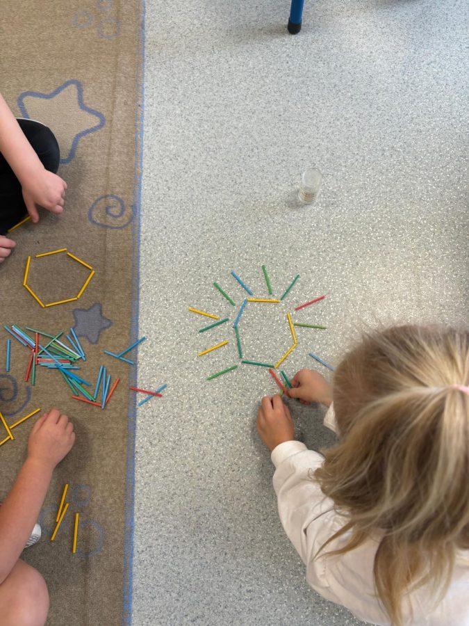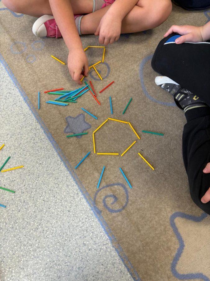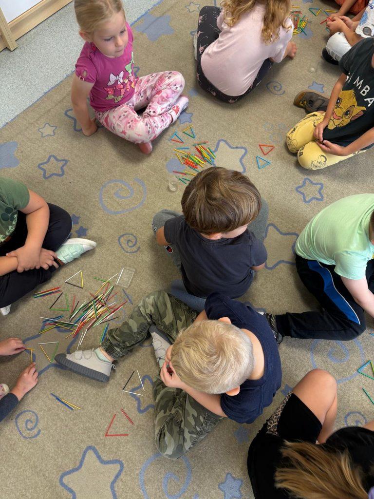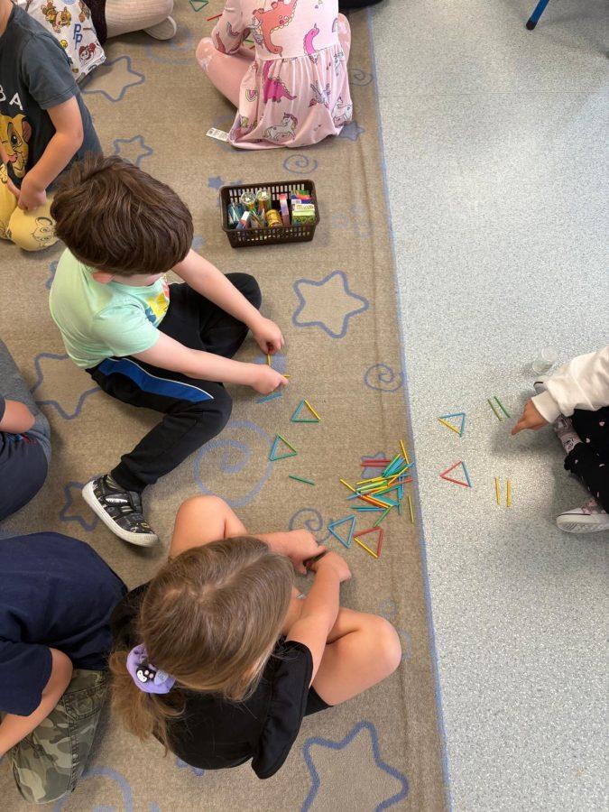Skoczki dzisiaj wykonywały działania matematyczne. „ Dodawanie na patyczkach” to metoda liczenia na konkretach. Zamiast od razu przechodzić do działań na liczbach zapisanych symbolicznie (np. 3 + 2), dzieci manipulują patyczkami, guzikami czy klockami.