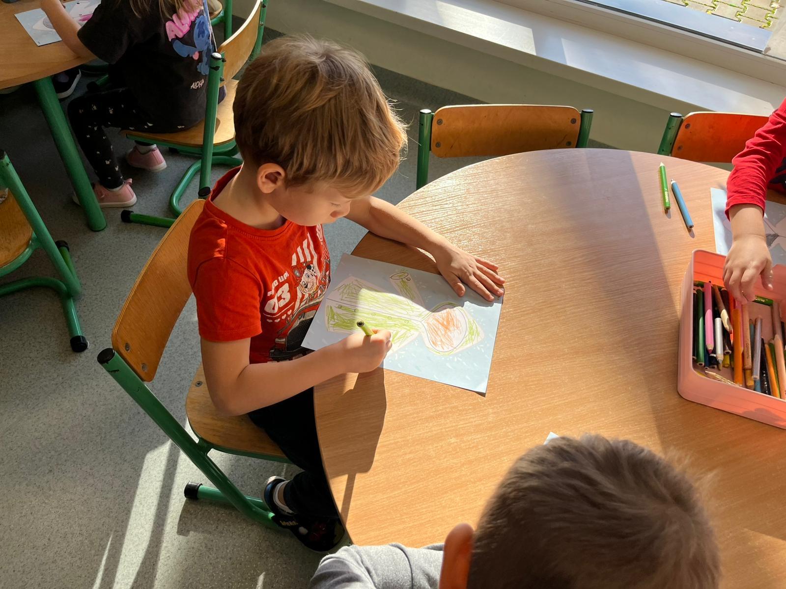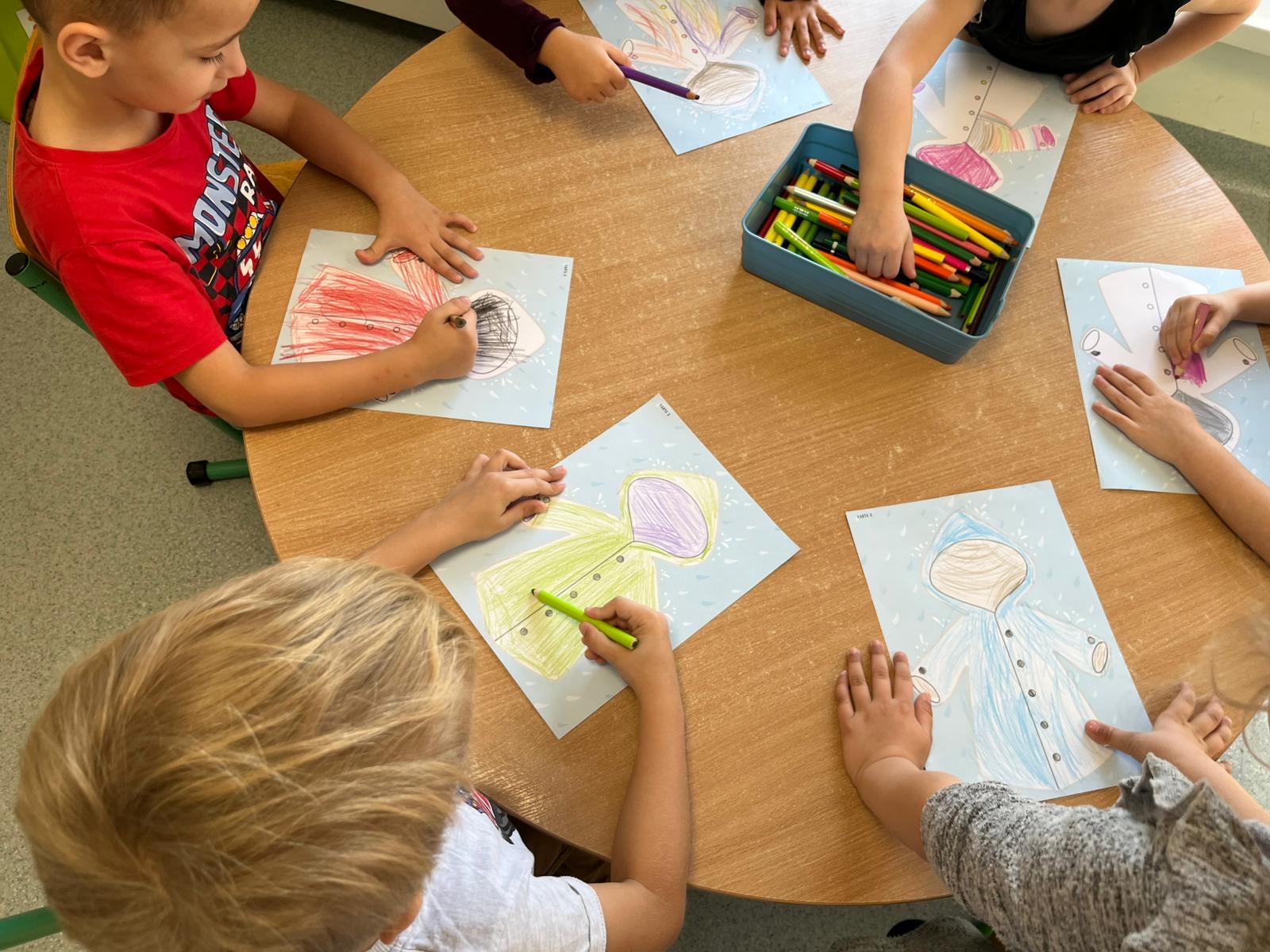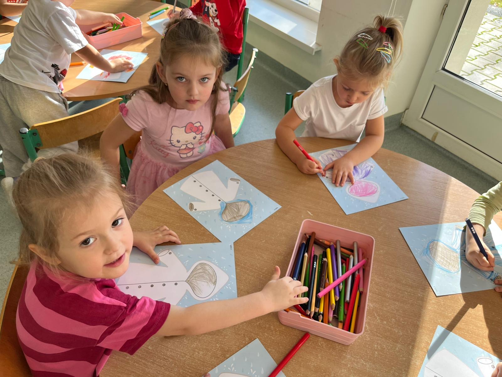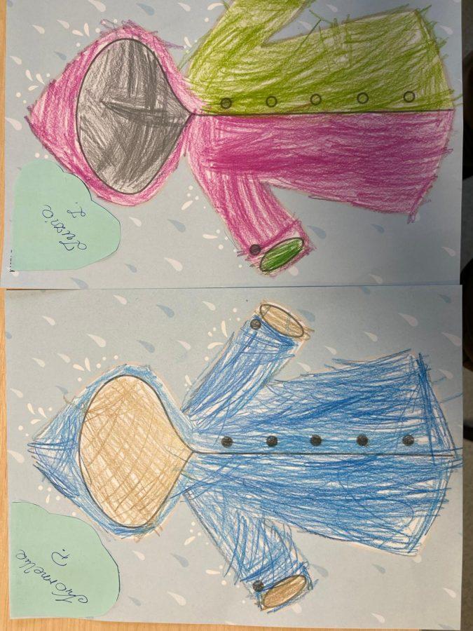Dziś w naszej grupie zrobiło się bardzo kreatywnie! „Biegusie” zamieniły się w prawdziwych projektantów mody. Dzieci wspólnie zaprojektowały wyjątkowy płaszczyk przeciwdeszczowy – kolorowy, ozdobiony wzorkami, serduszkami, chmurkami i tęczami.