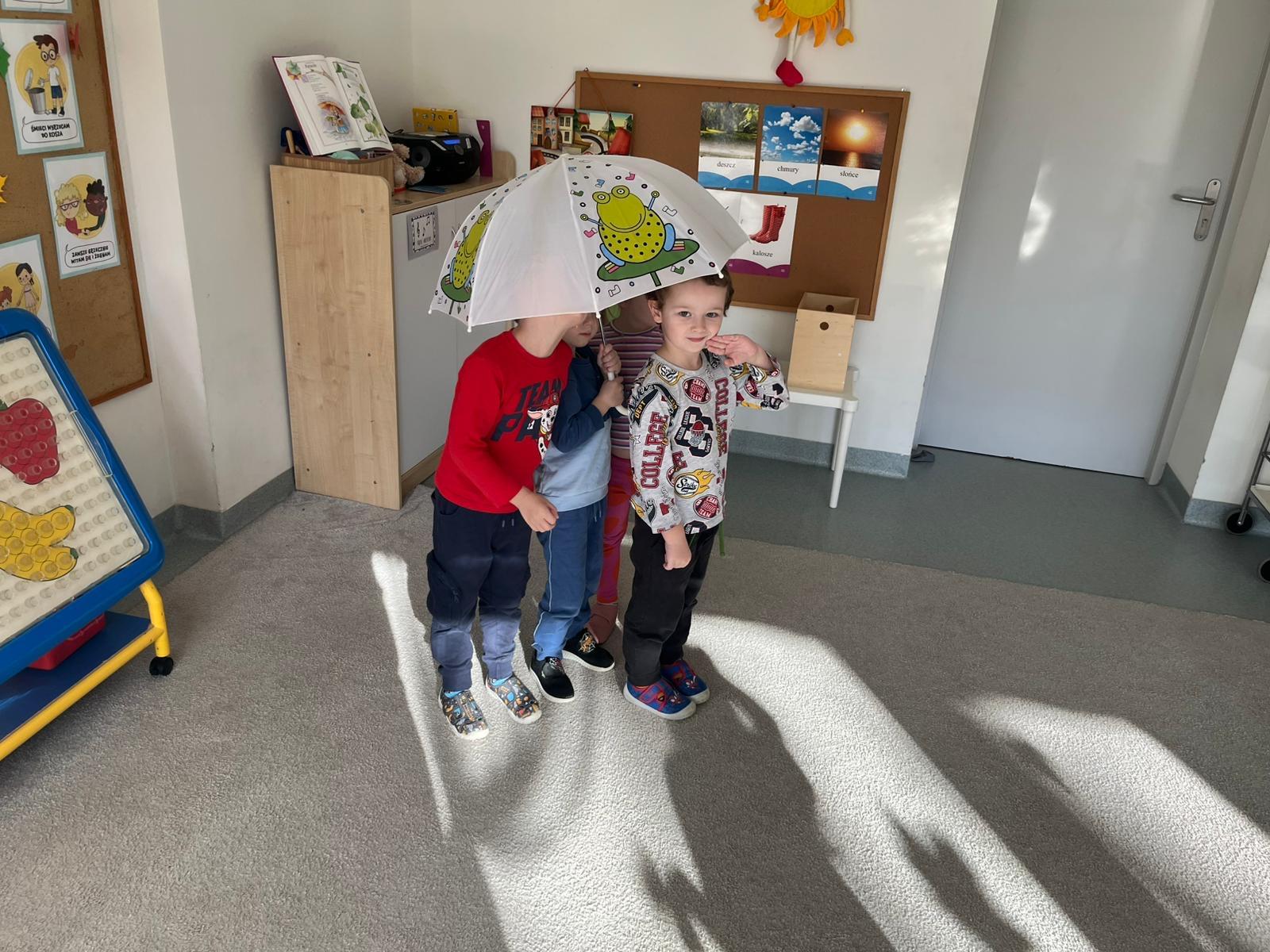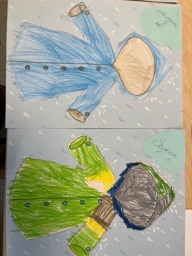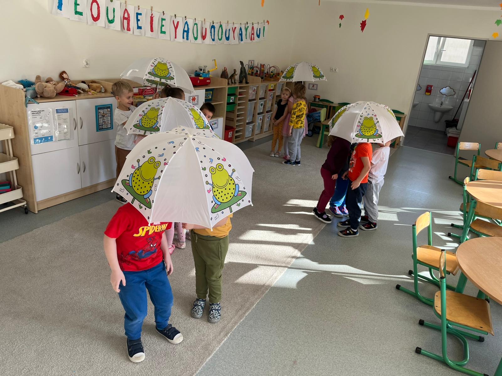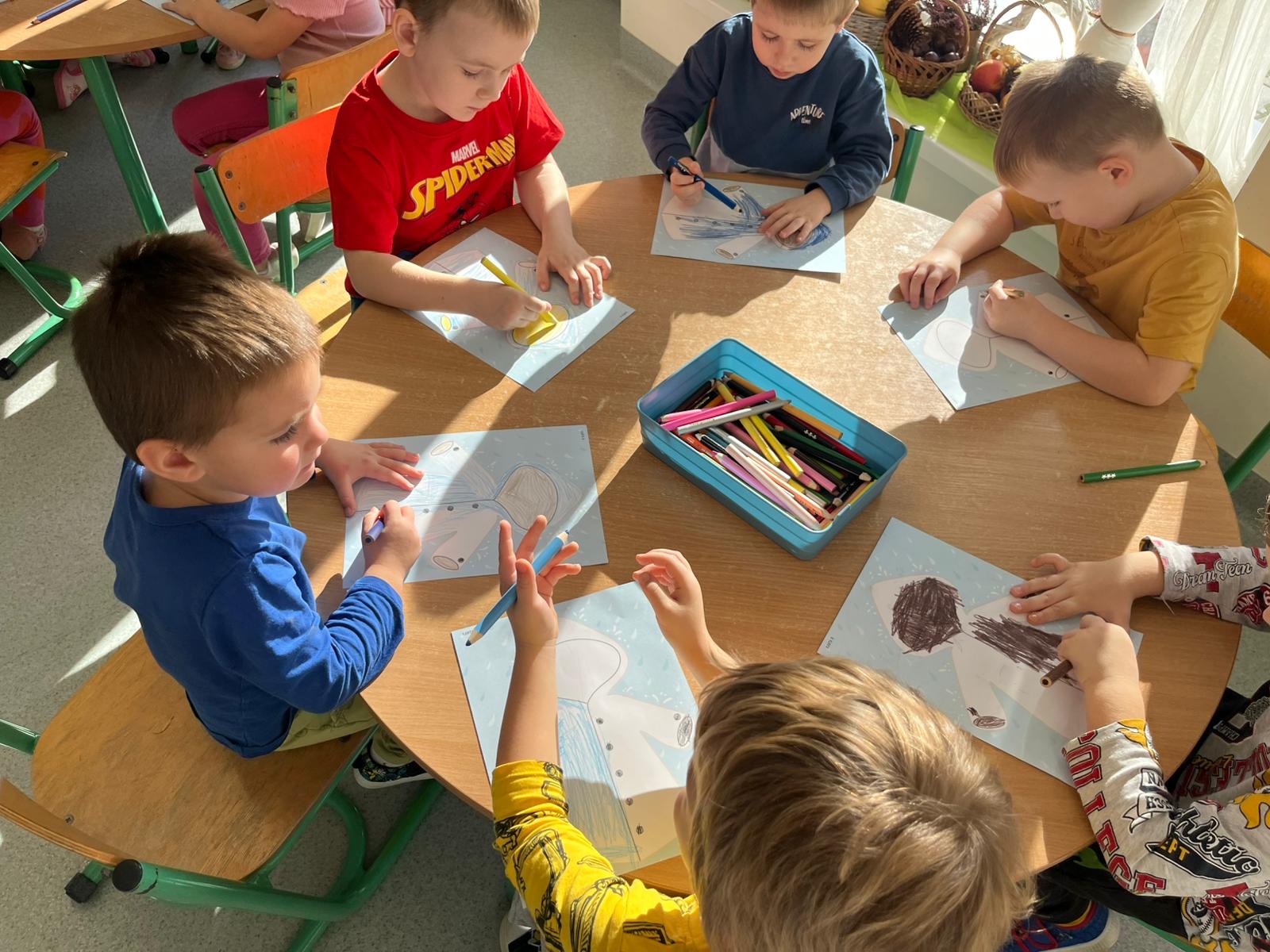 Dziś w naszej grupie zrobiło się bardzo kreatywnie! „Biegusie” zamieniły się w prawdziwych projektantów mody. Dzieci wspólnie zaprojektowały wyjątkowy płaszczyk przeciwdeszczowy – kolorowy, ozdobiony wzorkami, serduszkami, chmurkami i tęczami.