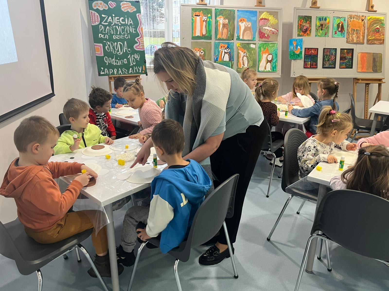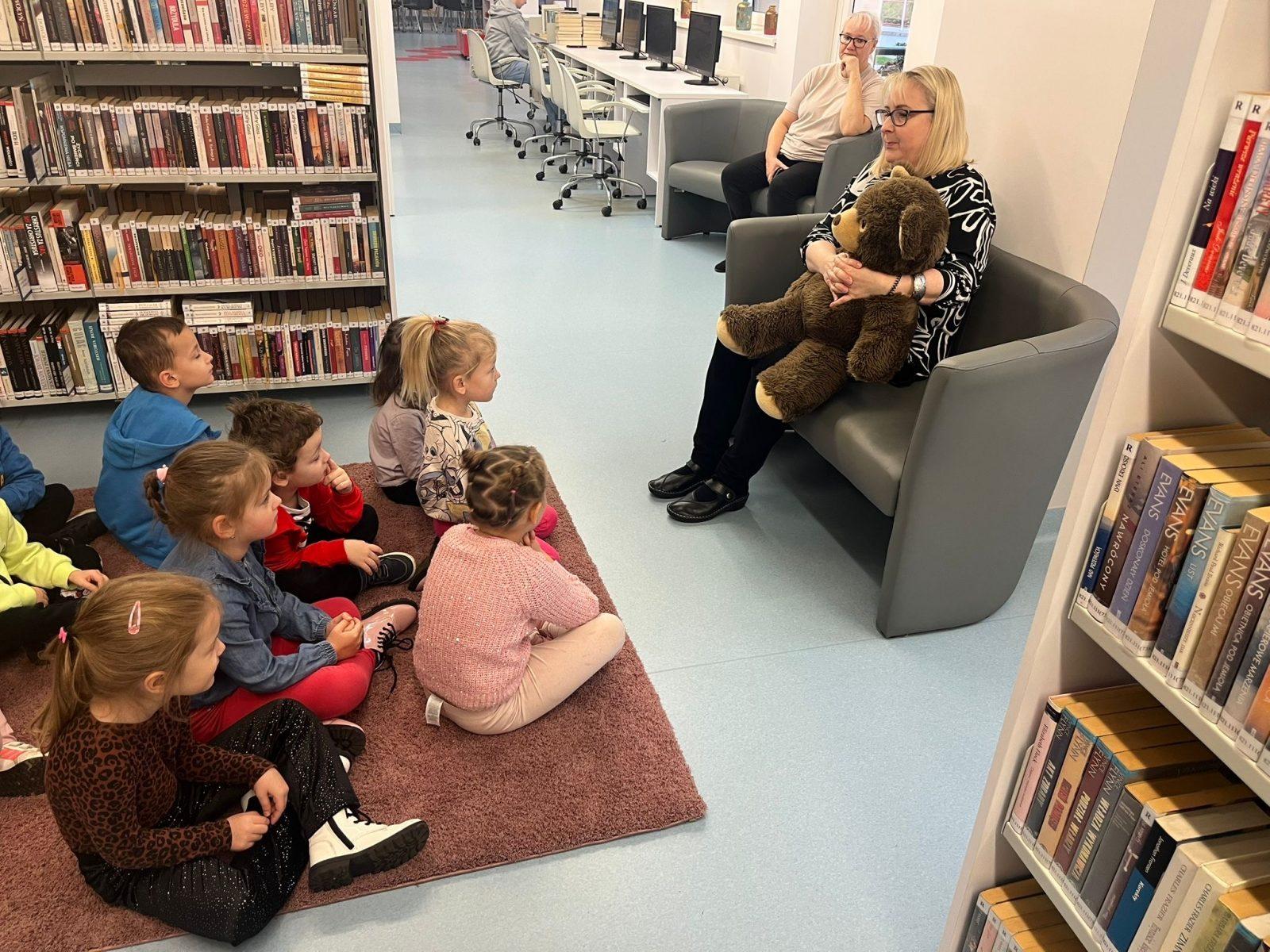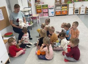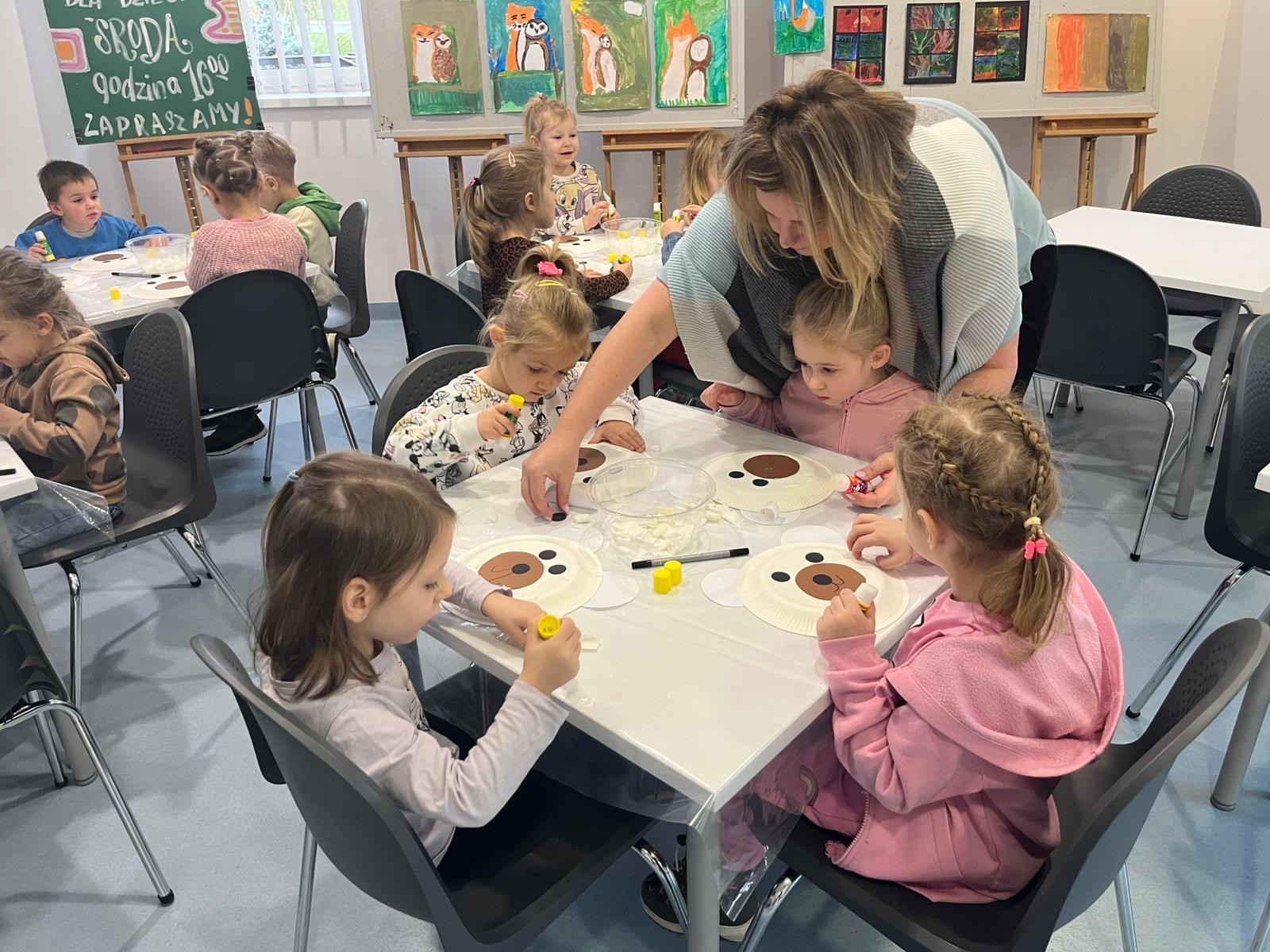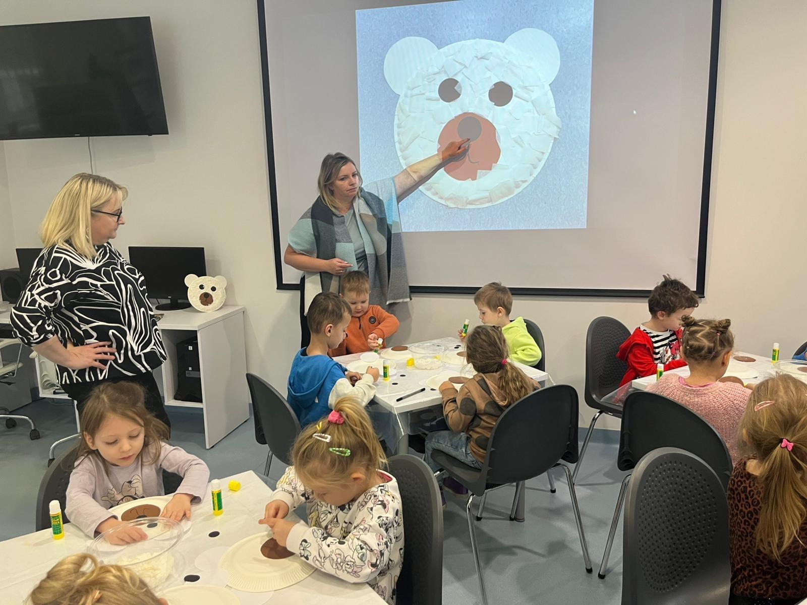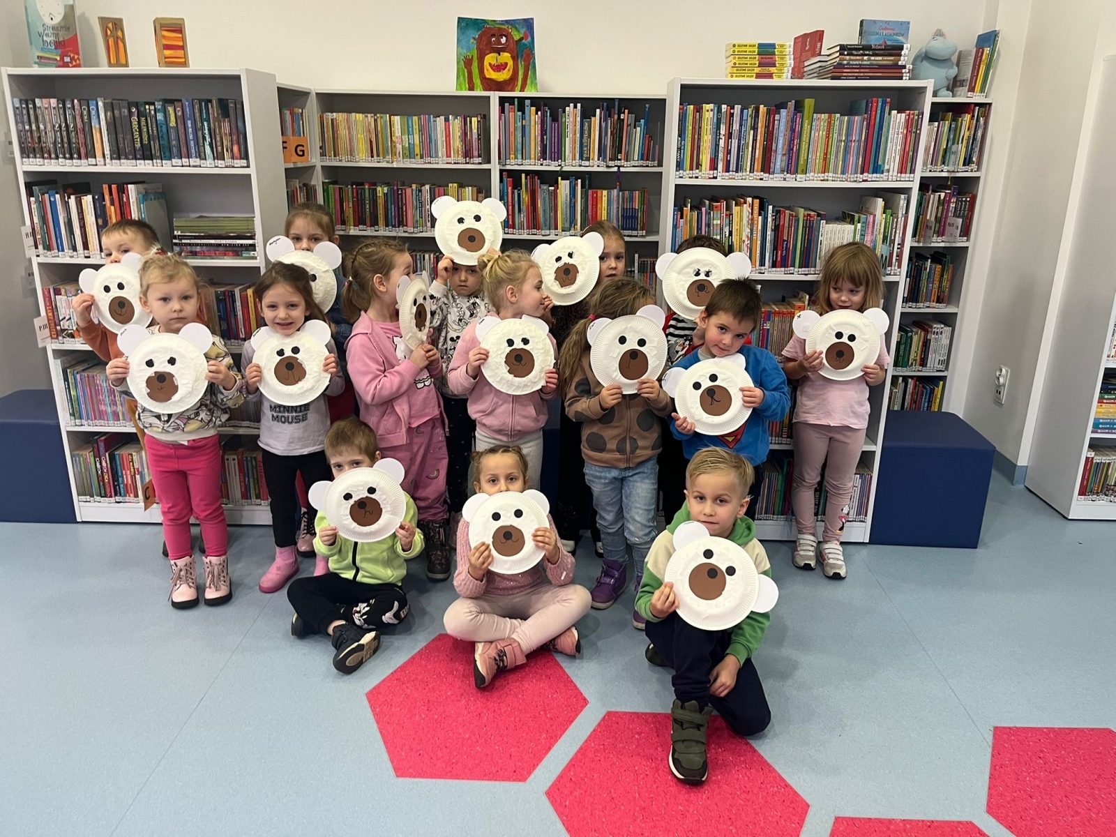 Podczas dzisiejszych zajęć w Bibliotece Publicznej dzieci wysłuchały książki „Mały miś w wielkim świecie”. Po lekturze odbyła się krótka pogadanka na temat przygód bohatera oraz poznanych wartości. Następnie przedszkolaki wykonały prace plastyczne – tworzyły postacie z użyciem kół o różnych rozmiarach. Zajęcia przebiegły w miłej atmosferze, rozwijając wyobraźnię, umiejętności językowe i sprawność manualną dzieci.