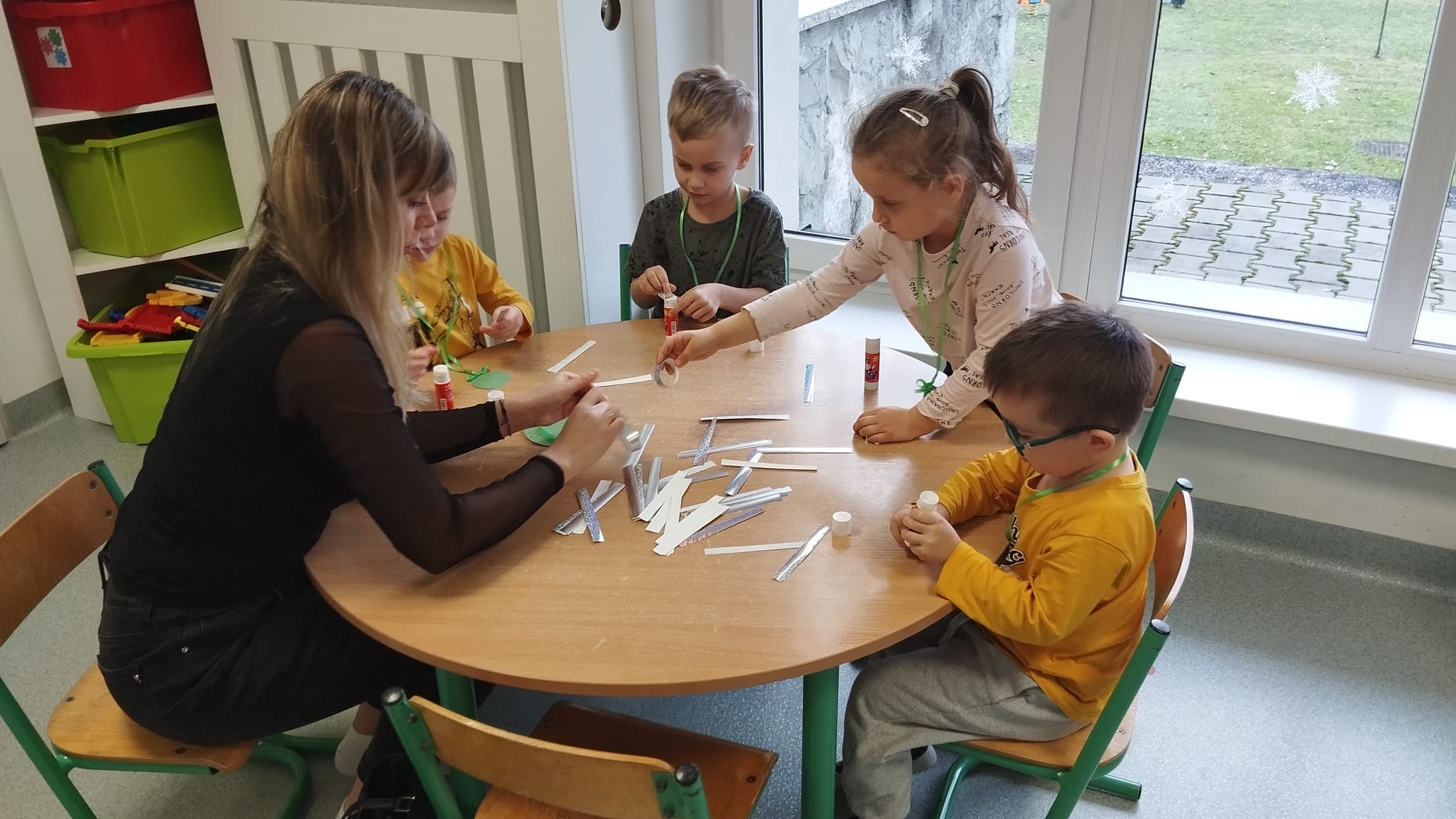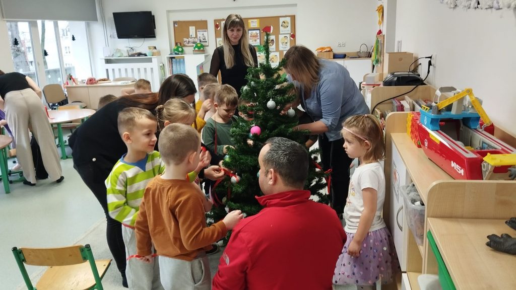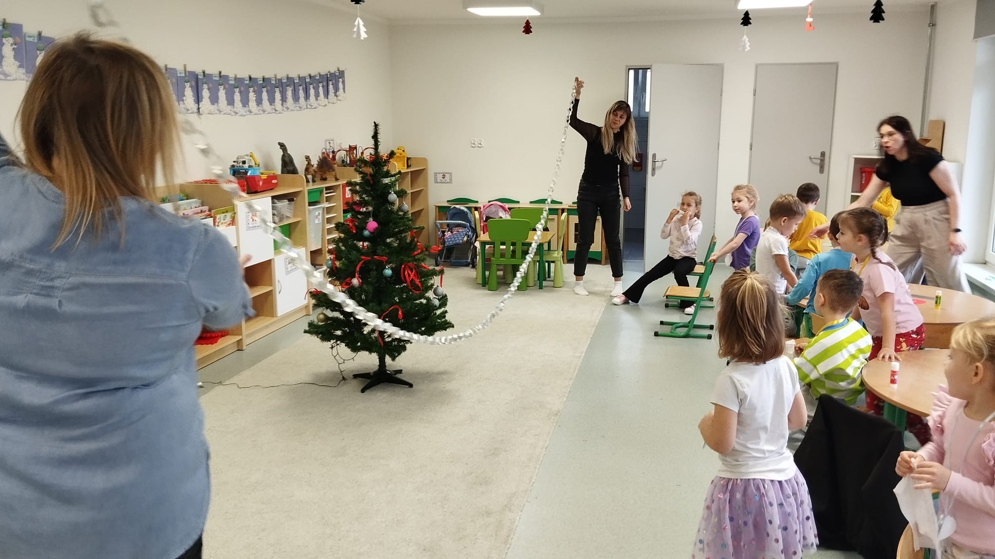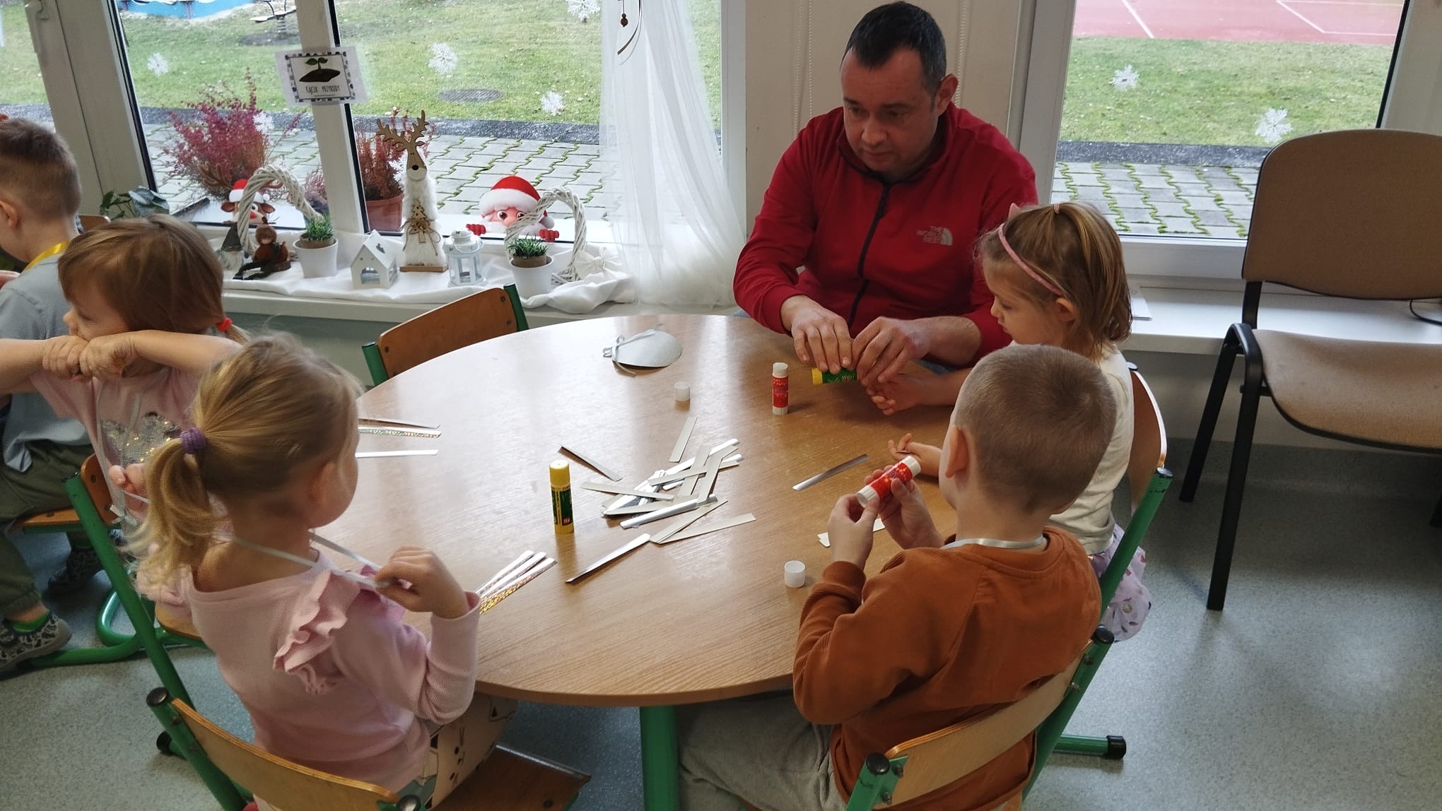 Zajęcia otwarte dla rodziców były wyjątkowym i radosnym spotkaniem. Dzieci wraz z rodzicami wspólnie tworzyły piękny, łańcuch na przedszkolną choinkę. Wspólna praca sprawiła wszystkim wiele radości, sprzyjała integracji oraz wzmacniała więzi rodzinne. Dzieci z dumą prezentowały swoje umiejętności, a rodzice mieli okazję aktywnie uczestniczyć w życiu grupy. Powstały łańcuch stał się piękną ozdobą wspólnej choinki i symbolem współpracy oraz świątecznej atmosfery.